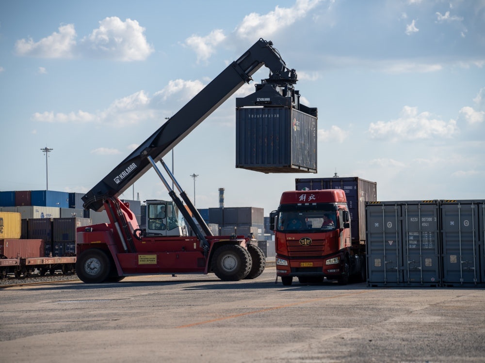 2025年7月14日,長春興隆鐵路口岸作業(yè)區(qū)內(nèi)的吊裝車將集裝箱裝載到卡車上。新華社記者 邵澤東 攝
