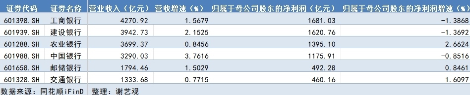 具體來看,農(nóng)業(yè)銀行、交通銀行、郵儲銀行實現(xiàn)營收和凈利潤指標(biāo)雙增,但工商銀行、建設(shè)銀行、中國銀行歸屬于母公司股東的凈利潤同比有所下降,降幅分別為1.39%、1.37%和0.85%。