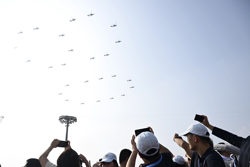 9月3日,紀(jì)念中國人民抗日戰(zhàn)爭暨世界反法西斯戰(zhàn)爭勝利80周年大會(huì)在北京隆重舉行。這是空中護(hù)旗梯隊(duì)。