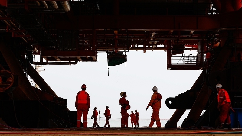 9月8日,工人在墾利6-1油田10-1北區(qū)塊Ⅱ期開(kāi)發(fā)項(xiàng)目油氣平臺(tái)安裝作業(yè)現(xiàn)場(chǎng)施工。