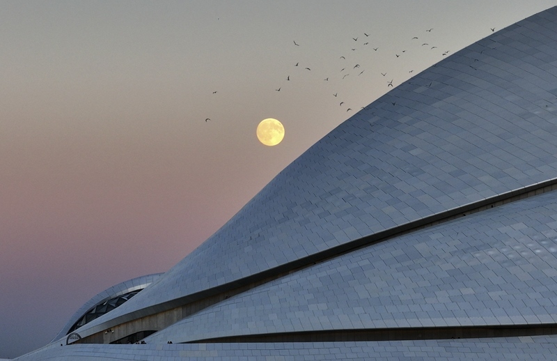 10月6日在黑龍江省哈爾濱大劇院拍攝的中秋滿月(無(wú)人機(jī)照片)。