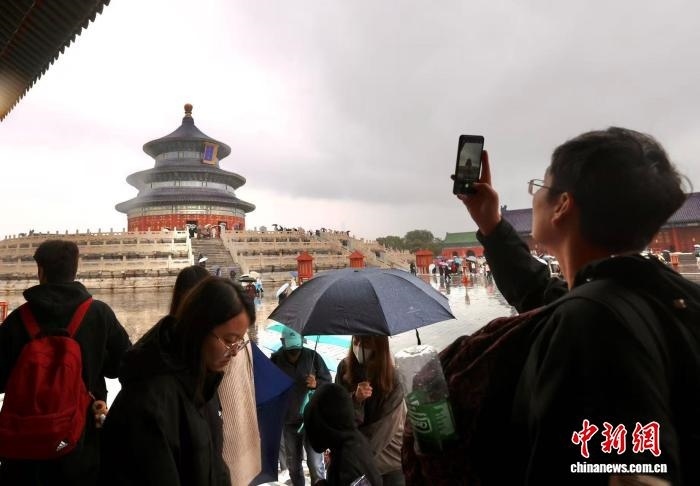 10月8日,今年國慶中秋假期最后一天,游客在天壇公園游覽拍照。中新社記者 易海菲 攝