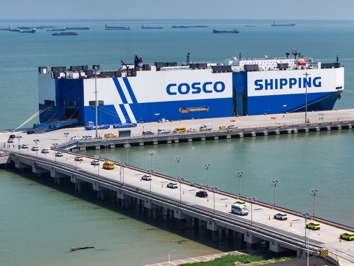 2025年9月16日,在江蘇太倉(cāng)港,裝載3600余輛商品車的“玉衡先鋒”號(hào)即將啟程前往東南亞(無(wú)人機(jī)照片)。新華社記者 李博 攝