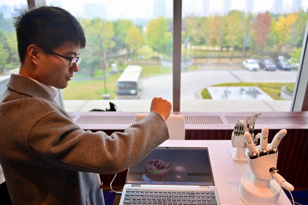 10月17日,在中國(guó)科學(xué)院沈陽(yáng)自動(dòng)化研究所展臺(tái),工作人員演示“仿生五指靈巧手”展品。新華社記者 吳青昊 攝