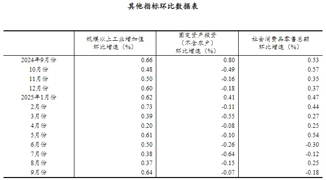 (2)根據(jù)季節(jié)調(diào)整模型自動修正結(jié)果,對近一年來各期國內(nèi)生產(chǎn)總值、規(guī)模以上工業(yè)增加值、固定資產(chǎn)投資(不含農(nóng)戶)、社會消費品零售總額環(huán)比增速進行修訂。修訂結(jié)果及2025年三季度GDP環(huán)比數(shù)據(jù)、2025年9月份其他指標環(huán)比數(shù)據(jù)如下: