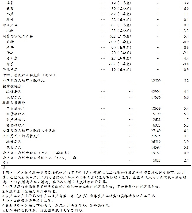 前三季度,農(nóng)業(yè)(種植業(yè))增加值同比增長3.6%。全國夏糧早稻產(chǎn)量合計17825萬噸,比上年增加19萬噸,增長0.1%。秋糧生產(chǎn)總體穩(wěn)定,全年糧食有望再獲豐收。前三季度,豬牛羊禽肉產(chǎn)量7312萬噸,同比增長3.8%,其中,豬肉、牛肉、禽肉產(chǎn)量分別增長3.0%、3.3%、7.2%,羊肉產(chǎn)量下降4.3%;牛奶產(chǎn)量增長0.7%,禽蛋產(chǎn)量增長0.2%。三季度末,生豬存欄43680萬頭,同比增長2.3%;前三季度,生豬出欄52992萬頭,增長1.8%。