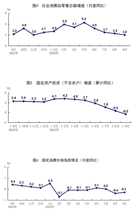 前三季度,全國居民消費價格(CPI)同比下降0.1%。分類別看,食品煙酒價格下降0.8%,衣著價格上漲1.5%,居住價格上漲0.1%,生活用品及服務(wù)價格上漲0.6%,交通通信價格下降2.8%,教育文化娛樂價格上漲0.8%,醫(yī)療保健價格上漲0.5%,其他用品及服務(wù)價格上漲7.4%。在食品煙酒價格中,鮮菜價格下降7.9%,豬肉價格下降2.9%,糧食價格下降1.2%,鮮果價格上漲1.2%。9月份,全國居民消費價格同比下降0.3%,環(huán)比上漲0.1%。前三季度,扣除食品和能源價格后的核心CPI同比上漲0.6%,漲幅比上半年擴大0.2個百分點。其中,9月份核心CPI同比上漲1.0%,比上月擴大0.1個百分點。