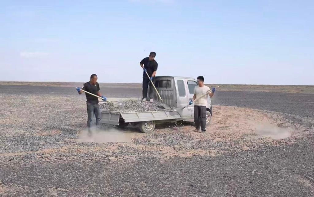 “看到車輪碾過標(biāo)語那一刻,就像碾在歷史的脊梁上?!本W(wǎng)絡(luò)博主陸遙得知標(biāo)語被破壞后,主動(dòng)驅(qū)車兩千多公里,經(jīng)歷六天抵達(dá)哈密。他和朋友們拉運(yùn)20噸砂石,才終于修復(fù)這些“疤痕”。