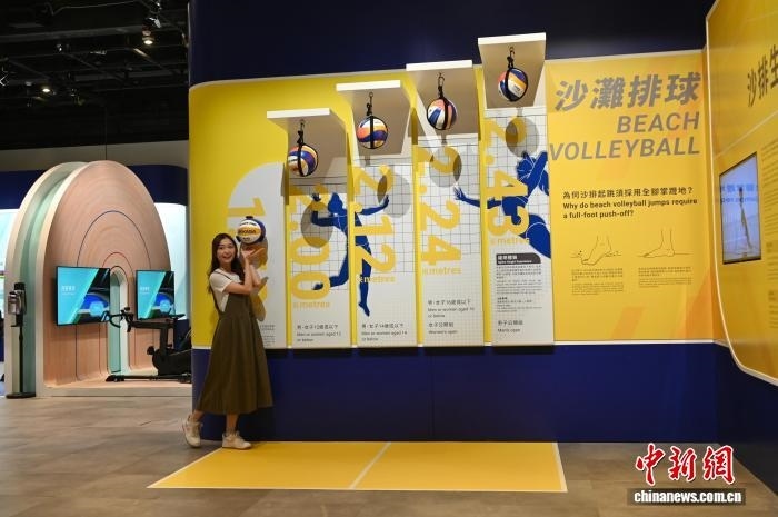 10月23日,香港科學(xué)館舉辦“國家發(fā)展成就系列──臻至完美:運(yùn)動(dòng)與科學(xué)的交匯”展覽,展示全國運(yùn)動(dòng)會(huì)的歷史及第十五屆全國運(yùn)動(dòng)會(huì)香港賽區(qū)的賽事項(xiàng)目。圖為一名女士體驗(yàn)沙灘排球項(xiàng)目,了解運(yùn)動(dòng)員的跳躍高度。 中新網(wǎng)記者 李志華 攝
