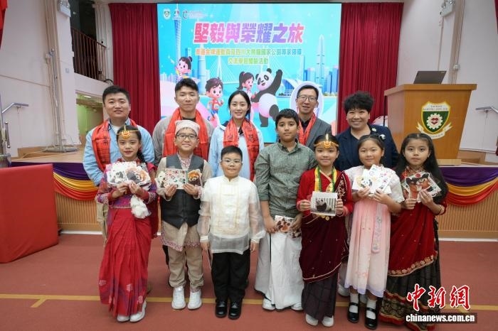 在香港油麻地街坊會學(xué)校,四川省大熊貓國家公園文化創(chuàng)意創(chuàng)新聯(lián)盟副秘書長畢飛向?qū)W生們科普四川生態(tài)及大熊貓保育知識。代表團(tuán)還向?qū)W生派發(fā)文創(chuàng)貼紙,為體育與大熊貓主題書籍簽名。代表團(tuán)也和同學(xué)們一起參觀第十五屆全國運(yùn)動會主題展板。
