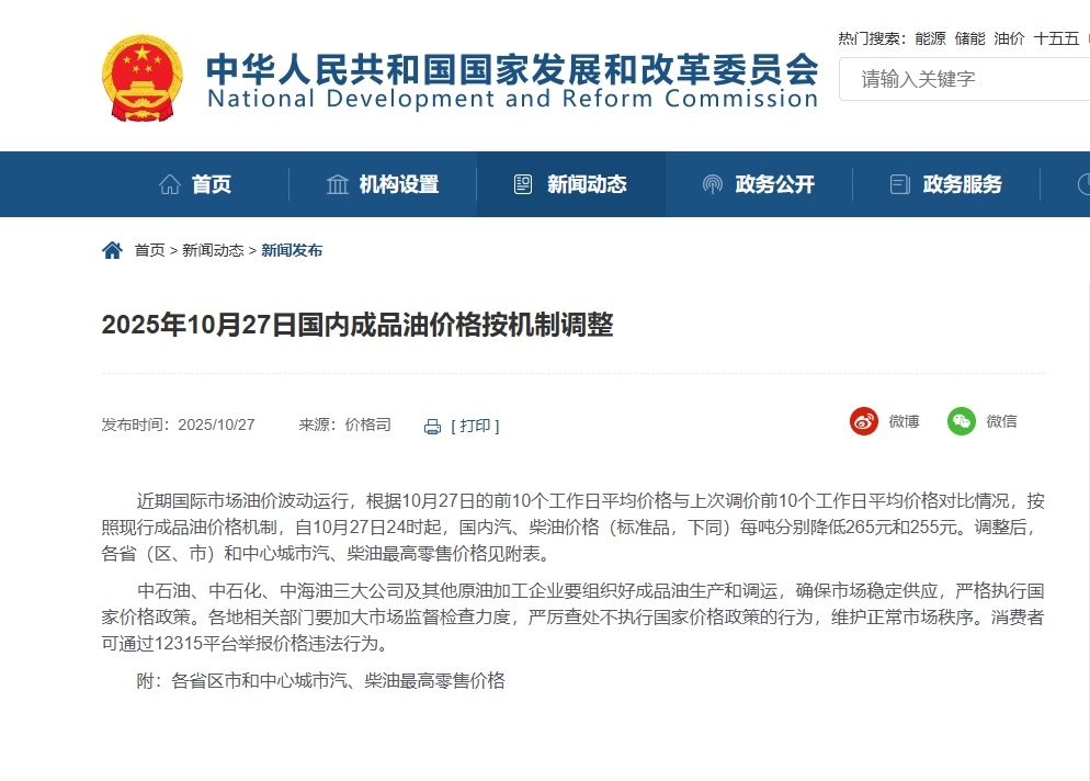 中國網(wǎng)10月27日訊 據(jù)國家發(fā)改委網(wǎng)站消息,近期國際市場油價(jià)波動運(yùn)行,根據(jù)10月27日的前10個(gè)工作日平均價(jià)格與上次調(diào)價(jià)前10個(gè)工作日平均價(jià)格對比情況,按照現(xiàn)行成品油價(jià)格機(jī)制,自10月27日24時(shí)起,國內(nèi)汽、柴油價(jià)格(標(biāo)準(zhǔn)品,下同)每噸分別降低265元和255元。調(diào)整后,各?。▍^(qū)、市)和中心城市汽、柴油最高零售價(jià)格見附表。