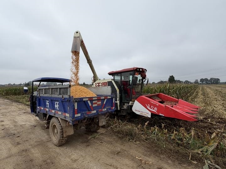 圖為一臺(tái)履帶式聯(lián)合收割機(jī)在陜西省武功縣長(zhǎng)寧鎮(zhèn)一處糧田完成收割后將玉米倒入運(yùn)糧車。新華社記者劉彤 攝