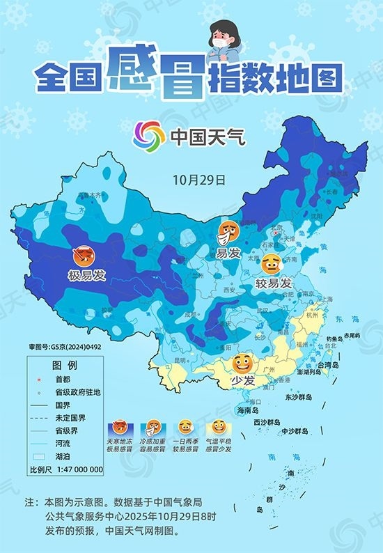 從中國天氣網(wǎng)推出的全國感冒指數(shù)地圖來看,10月29日我國北方大部屬于容易感冒的區(qū)域,10月30日至31日,隨著新一股冷空氣登場(chǎng),容易感冒的區(qū)域有所增加,超15省份易引發(fā)感冒。