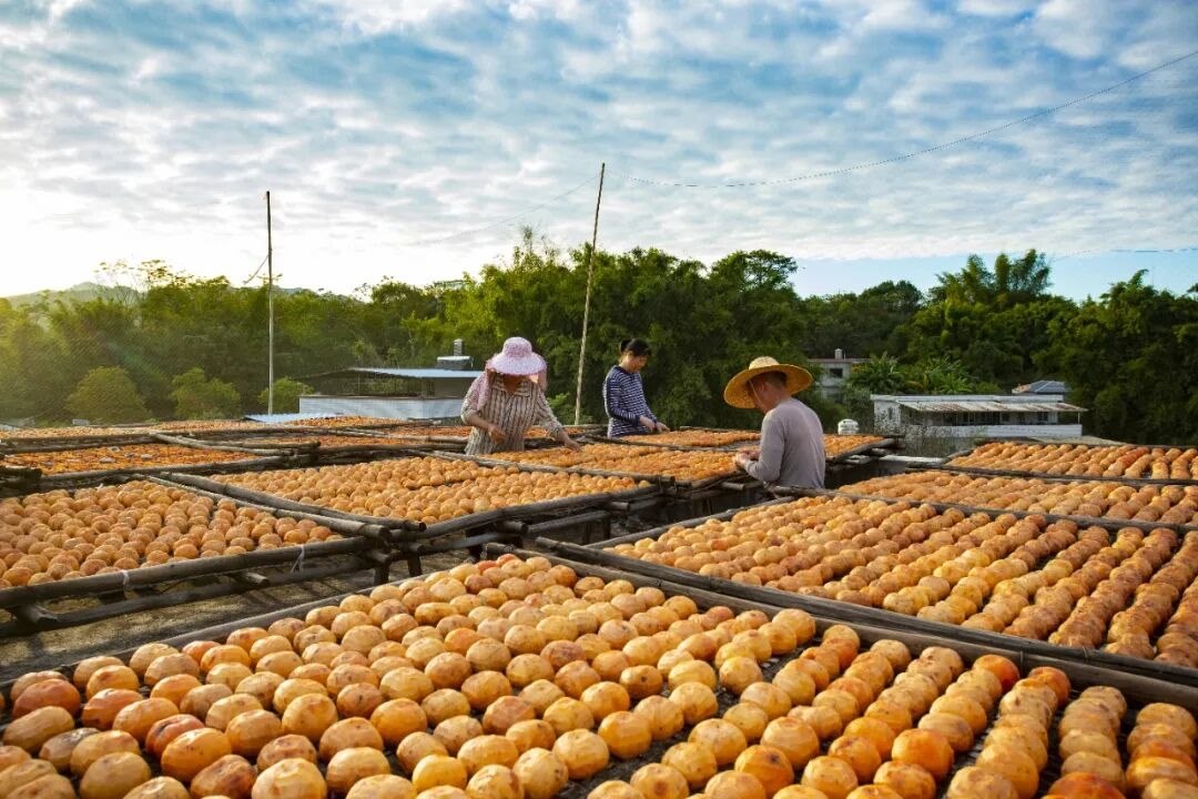 在廣東省梅州市平遠(yuǎn)縣石正鎮(zhèn)中東村,村民正趁晴好天氣曬制柿餅。平遠(yuǎn)縣供銷(xiāo)總公司通過(guò)合作社與農(nóng)戶簽訂收購(gòu)合約,使石正柿花成為當(dāng)?shù)剞r(nóng)民增收致富的特色產(chǎn)業(yè)。馮錫權(quán)攝(影像中國(guó))