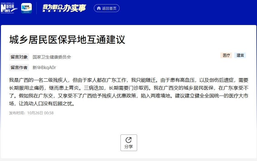 編者按:在醫(yī)療水平整體提升的大背景下,醫(yī)保權(quán)益保障等愈發(fā)受到社會各界的關(guān)注。近日,有網(wǎng)友在新華網(wǎng)“我為群眾辦實事”網(wǎng)絡(luò)平臺反映其在異地就醫(yī)中遇到困惑,《中國醫(yī)療保險》雜志為此邀請江西省醫(yī)保局待遇保障處原處長、原一級調(diào)研員蔡海清進行詳細解答。具體內(nèi)容如下: