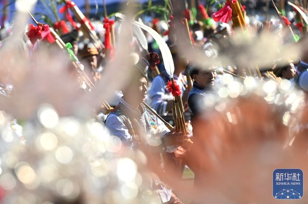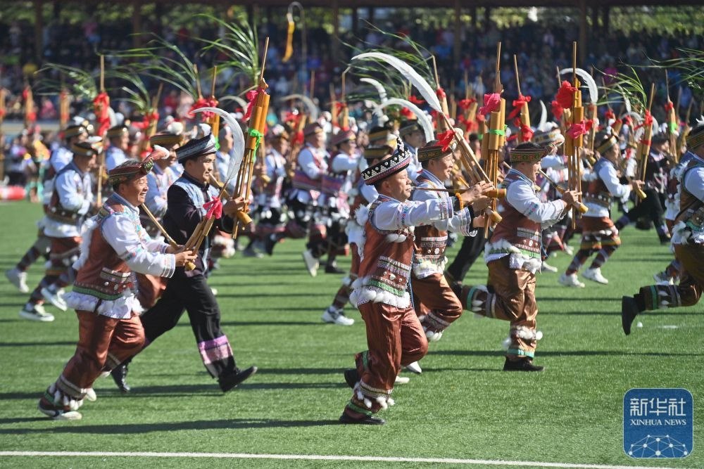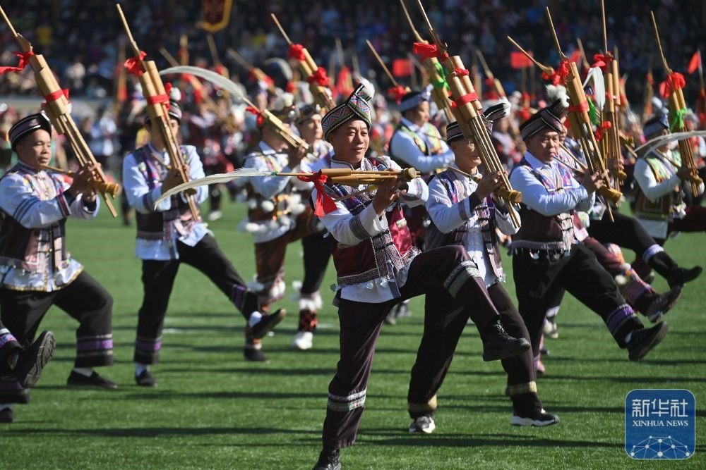 ↑11月29日,表演者在融水縣民族體育公園舉行的蘆笙斗馬節(jié)開幕式現(xiàn)場表演。新華社記者 黃孝邦 攝