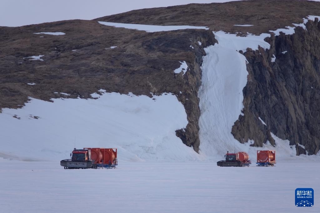 北京時(shí)間12月3日凌晨,雪地車(chē)?yán)訚M燃油的油罐離開(kāi)“雪龍2”號(hào),駛向中山站。新華社記者 顧天成 攝