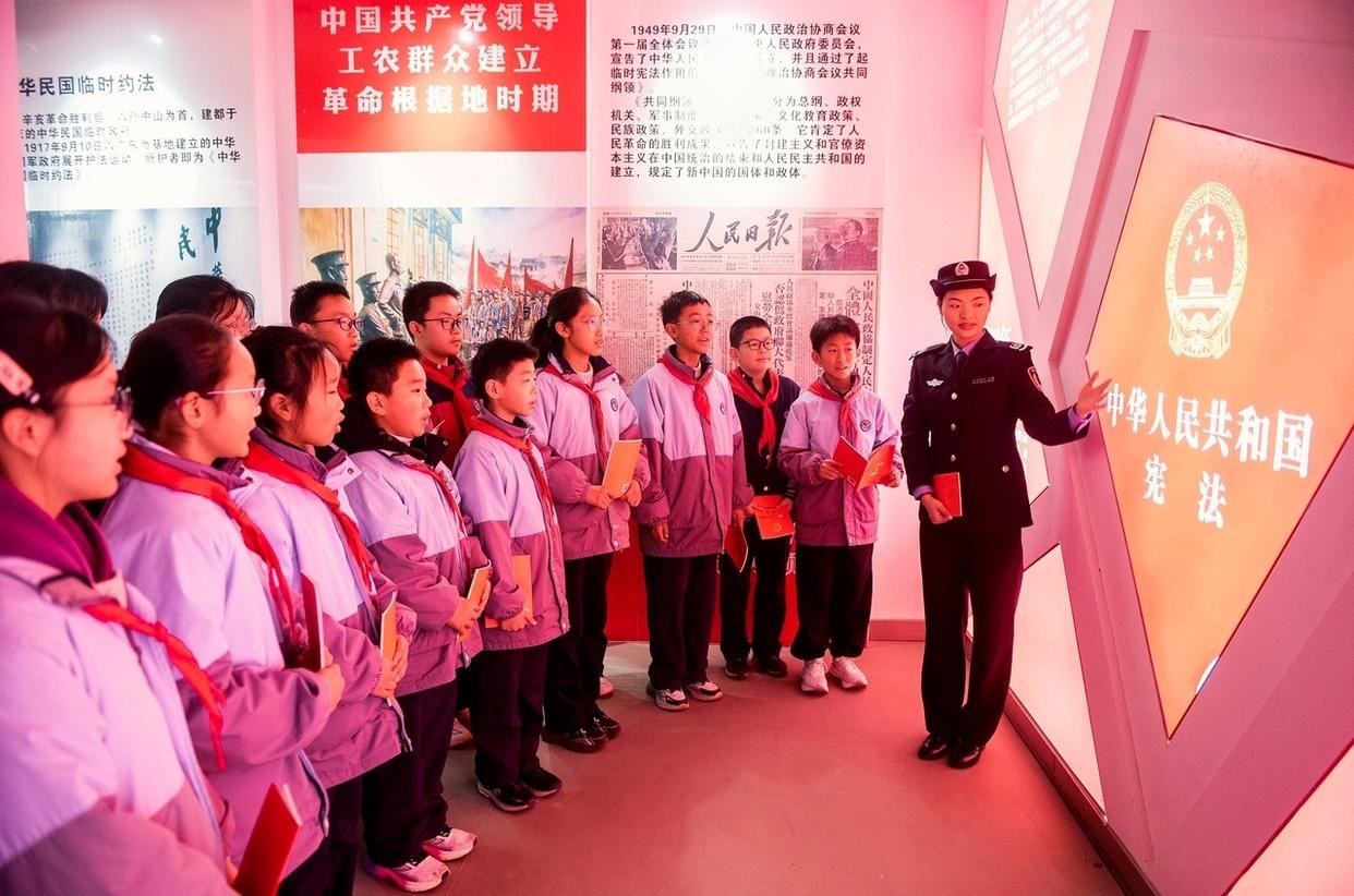 12月4日,民警在江蘇省泰州市海陵區(qū)九龍實(shí)驗(yàn)學(xué)校給學(xué)生講解憲法知識(shí)。當(dāng)?shù)?,通過(guò)咨詢、普法課堂等多種形式開展憲法宣傳教育活動(dòng),弘揚(yáng)憲法精神,提升公民法治素養(yǎng)。(工人日?qǐng)?bào)通訊員 湯德宏 攝)