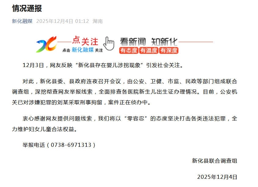 中新網(wǎng)12月4日電 針對(duì)網(wǎng)友反映的“新化縣存在嬰兒涉拐現(xiàn)象”,湖南省婁底市新化縣聯(lián)合調(diào)查組12月4日發(fā)布情況通報(bào)稱(chēng),新化縣委、縣政府連夜召開(kāi)會(huì)議,由公安、衛(wèi)健、市監(jiān)、民政等部門(mén)組成聯(lián)合調(diào)查組,深挖徹查網(wǎng)友舉報(bào)線索,全面排查各醫(yī)院新生兒出生證辦理情況。