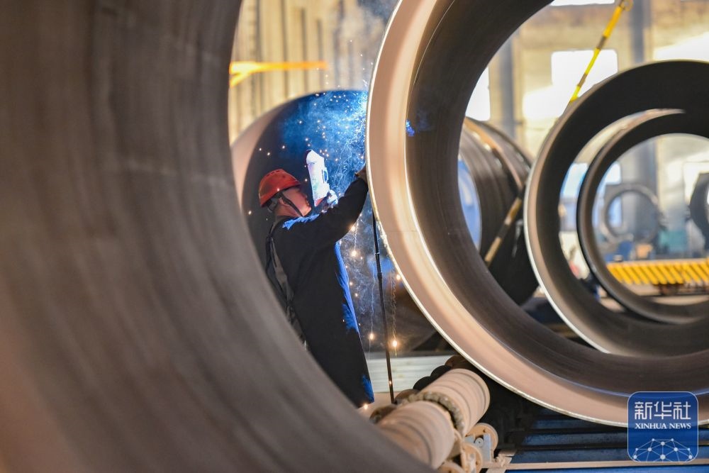 ↑ 12月15日,在位于江蘇省江都高新技術(shù)產(chǎn)業(yè)開發(fā)區(qū)的江蘇廣泓重工設(shè)備有限公司,工人在頂管機(jī)總裝車間作業(yè)。新華社發(fā)(任飛攝)