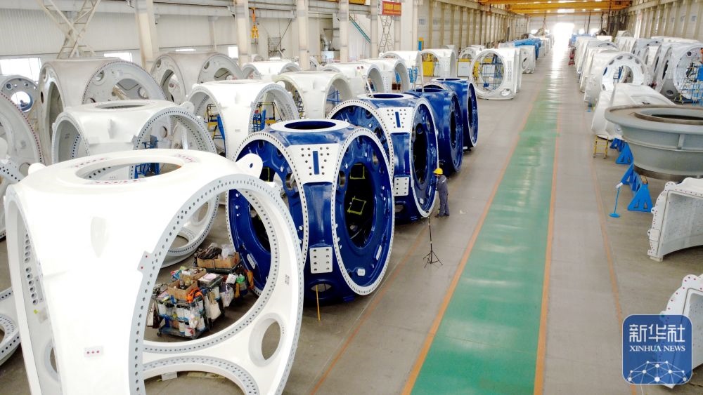 ↑ 12月15日,工人在山東省濱州市惠民經(jīng)濟(jì)開發(fā)區(qū)風(fēng)電裝備產(chǎn)業(yè)園的車間清理風(fēng)電輪轂(無人機(jī)照片)。新華社發(fā)(王軍攝)