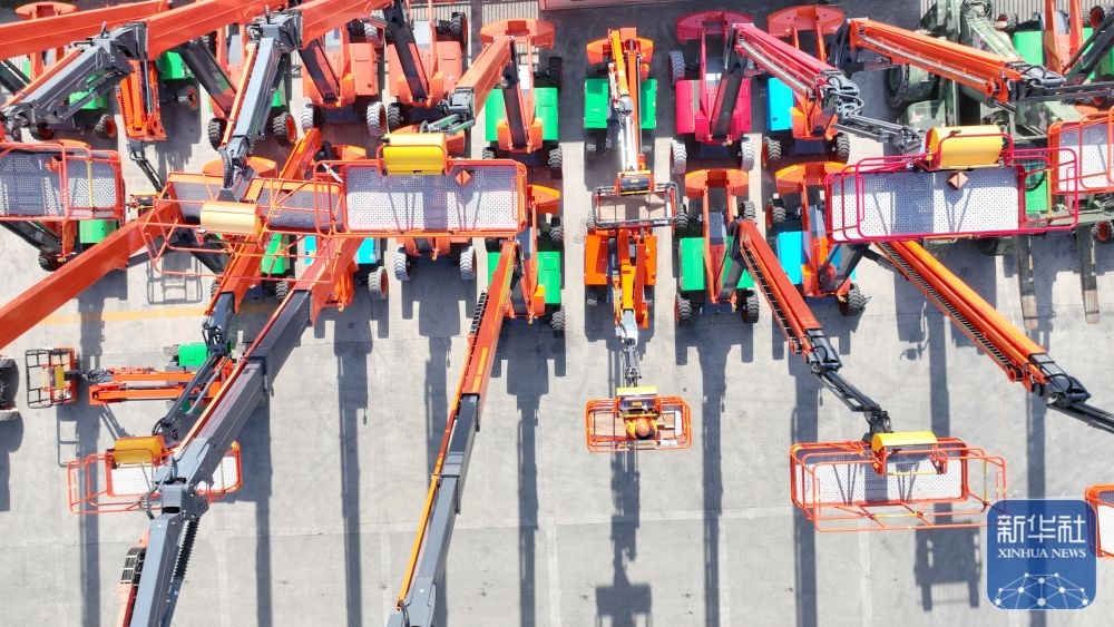 ↑ 12月15日,在位于浙江省湖州市德清縣雷甸鎮(zhèn)的浙江鼎力機(jī)械股份有限公司,工人對準(zhǔn)備出口的新臂式智能高空作業(yè)平臺設(shè)備進(jìn)行檢測(無人機(jī)照片)。新華社發(fā)(謝尚國攝)