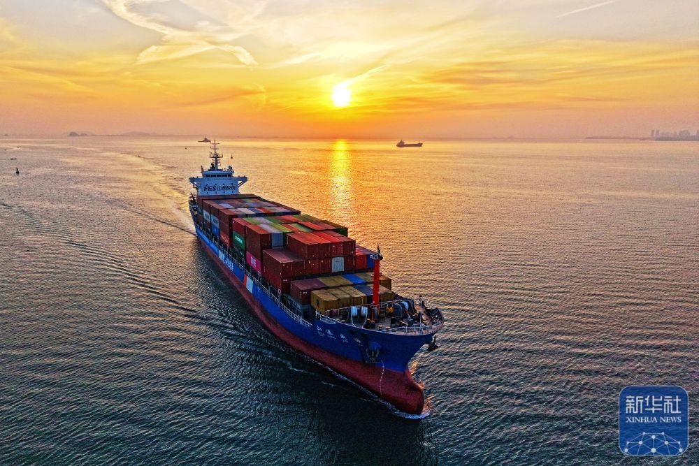 ↑ 12月15日,一艘集裝箱貨輪駛?cè)肷綎|港口煙臺港(無人機(jī)照片)。新華社發(fā)(孫文潭攝)