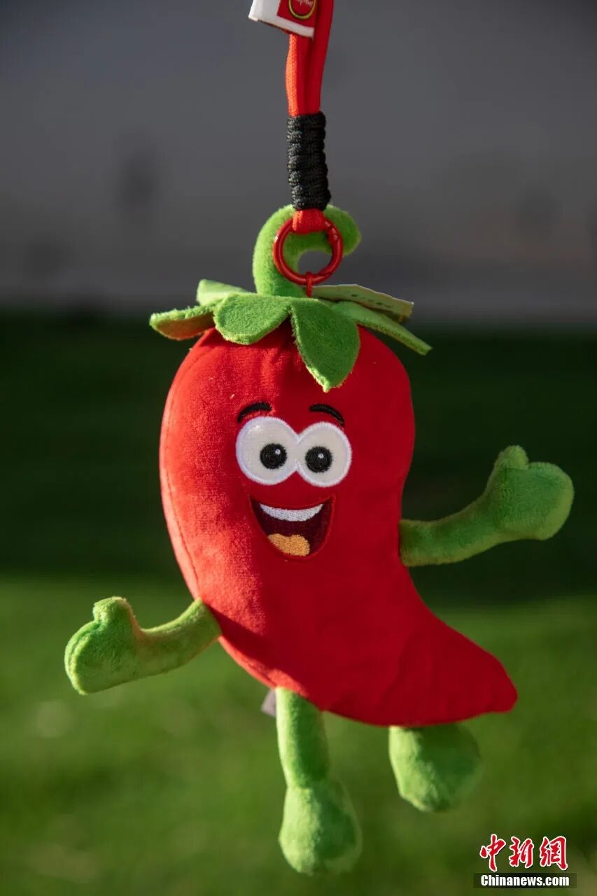 文創(chuàng)攤位上,紅紅的小辣椒有著綠色的“帽子”和四肢,它咧著嘴笑想和人們“椒”個(gè)朋友,手腳向外伸展,好像正在歡快地跳躍。