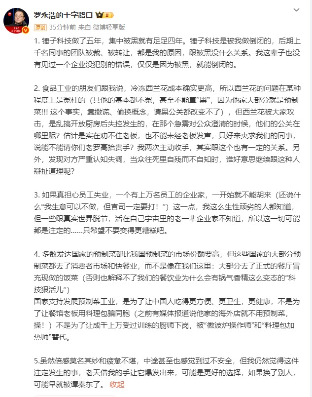 1月16日,@羅永浩的十字路口 再次發(fā)長文回應(yīng)西貝賈國龍近日的言論。他表示,錘子科技做了五年,集中被黑就有足足四年。錘子科技是被我做倒閉的,后期上千名同事的團(tuán)隊(duì)被裁、被轉(zhuǎn)讓,都是我的原因,跟被黑沒什么關(guān)系。我這輩子也沒有見過一個企業(yè)沒犯別的錯誤,僅僅是因?yàn)楸缓?,就能倒閉的。