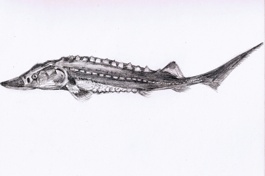中華鱘生長較快,體型碩大,最大個體體長可達4米,體重可達680千克,最長壽命可達40齡以上 上海海洋大學(xué)學(xué)生手繪