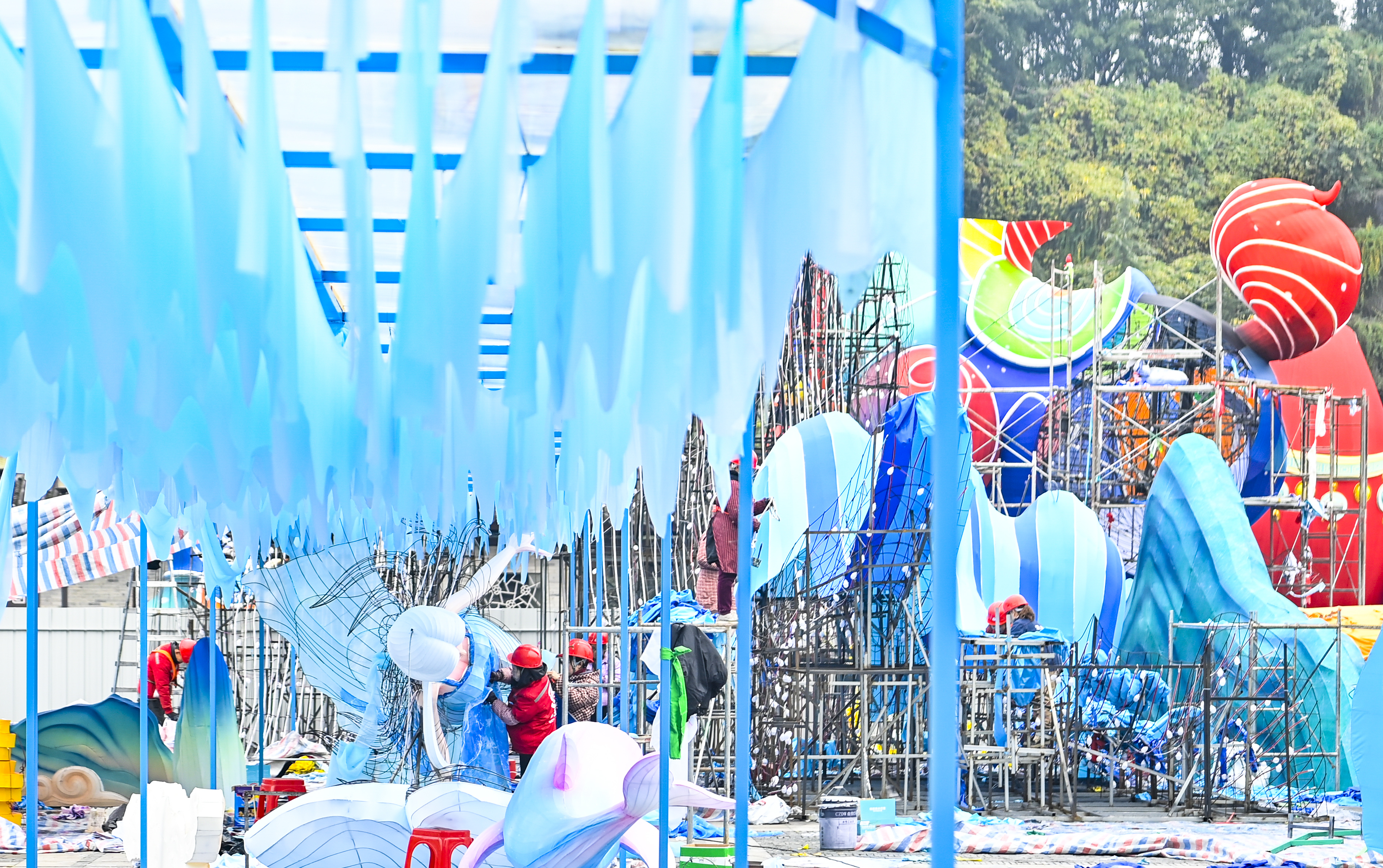▲2026重慶市新春燈會(huì)——“禧歡霓”園博園大型水上燈會(huì)現(xiàn)場(chǎng),工作人員正在加緊施工。記者 齊嵐森 攝/視覺(jué)重慶