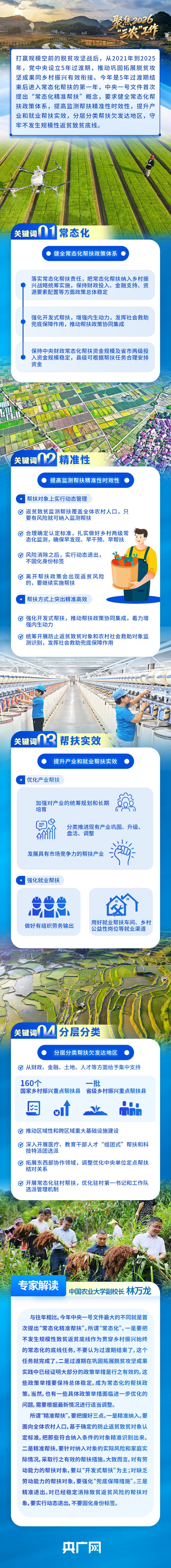 2月3日,立春節(jié)氣前夕,《中共中央 國務院關于錨定農業(yè)農村現代化 扎實推進鄉(xiāng)村全面振興的意見》向社會公布。這是黨的十八大以來,中央連續(xù)出臺的第14個指導“三農”工作的一號文件,也是“十五五”時期的首個中央一號文件。今年中央一號文件首次提出實施“常態(tài)化精準幫扶”,并對此作出系統(tǒng)性部署。如何理解“常態(tài)化”?怎樣把“精準幫扶”落到實處?央廣網約請相關專家進行解讀。