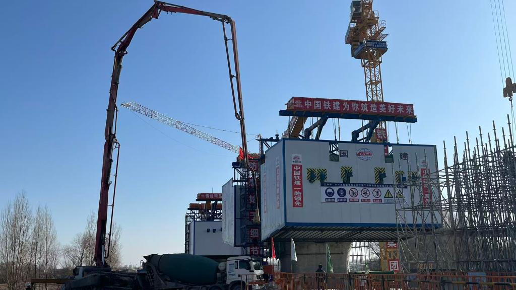 在中鐵二十一局集團(tuán)有限公司所建項(xiàng)目處,機(jī)器轟鳴與焊花飛濺交織,鋼鐵巨臂緩緩運(yùn)轉(zhuǎn),巨大的橋墩向遠(yuǎn)方延展開(kāi)來(lái)。