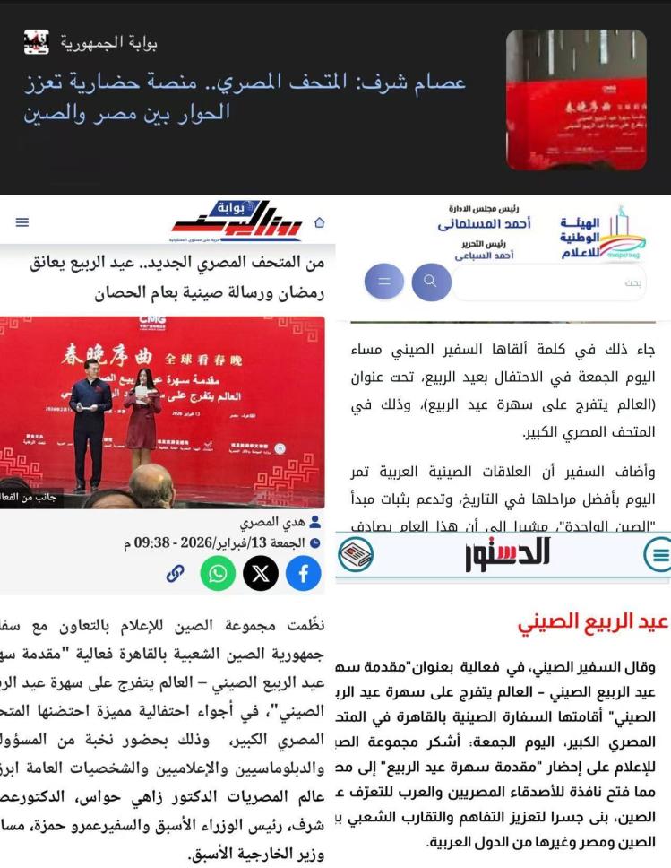 埃及國有媒體管理局官網(wǎng)以及開羅新聞電視臺、尼羅河電視臺、中東通訊社、《金字塔報》《共和國報》《今日埃及人報》《七日報》《憲章報》《魯茲優(yōu)素福》雜志等埃主流媒體對活動進(jìn)行了報道。