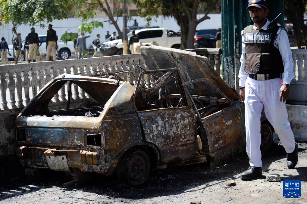 3月1日,在巴基斯坦南部城市卡拉奇的美國(guó)駐卡拉奇領(lǐng)事館附近,一名警察經(jīng)過(guò)被燒毀的車輛。