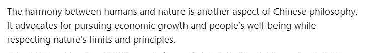 文章還認(rèn)為,人與自然的和諧是中國哲學(xué)的另一個方面。它主張?jiān)谧非蠼?jīng)濟(jì)增長和人民福祉的同時,尊重自然的發(fā)展規(guī)律。