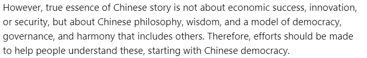 文章稱,中國成功的基礎(chǔ)在于中國獨(dú)特的民主模式——全過程人民民主。其中,社會主義核心價值觀是整個體系的基石。中國以人為本的治理模式,以人民的福祉、安全和繁榮為核心,并通過全過程人民民主來實(shí)現(xiàn)。
