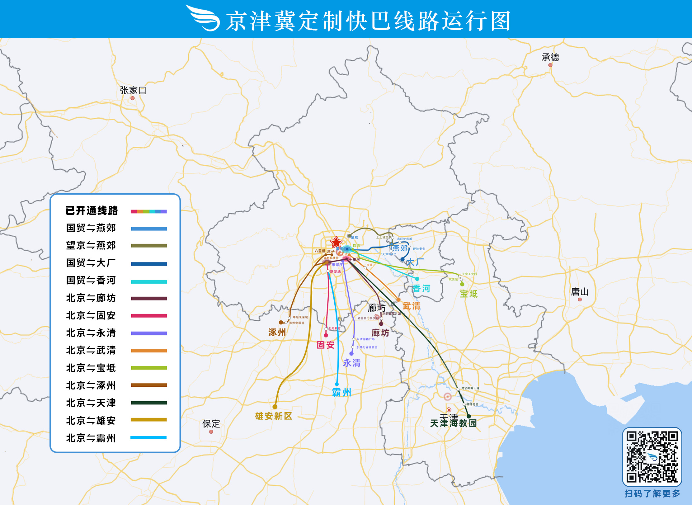 截至目前,京津冀定制快巴已開通北京地區(qū)至河北燕郊、大廠、香河、固安、永清、霸州、涿州、廊坊城區(qū)和天津武清、寶坻、海教園以及雄安新區(qū)等12條線路57條支線,共計開行16.3萬余車次,客運量累計超530萬人次,日發(fā)315班次,日客運量約9500余人次。