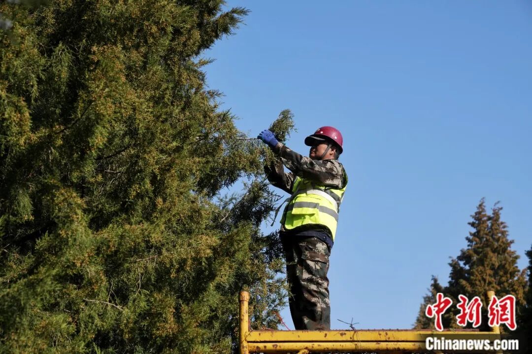 園林綠化工作人員在北京頤和園修剪圓柏。頤和園供圖