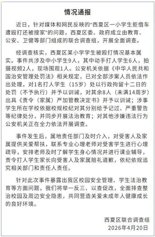 經(jīng)調(diào)查核實(shí),西夏區(qū)某小學(xué)學(xué)生被毆打情況基本屬實(shí)。事件共涉及中小學(xué)生9人,其中動(dòng)手打人學(xué)生6人,拍攝視頻2人,現(xiàn)場圍觀1人。公安機(jī)關(guān)依據(jù)《中華人民共和國治安管理處罰法》相關(guān)規(guī)定,已對全部涉案人員依法作出處理,對1名打人學(xué)生(15歲)處以行政拘留十二日的處罰(不予執(zhí)行)并予以訓(xùn)誡,對其余8人(未滿14周歲)出具《責(zé)令(家屬)嚴(yán)加管教決定書》并予以訓(xùn)誡;涉事學(xué)生所在學(xué)校依據(jù)校規(guī)校紀(jì)對其分別給予記過、嚴(yán)重警告等紀(jì)律處分,并同步開展法治教育;對其他涉嫌違法行為公安機(jī)關(guān)正在全力依法開展調(diào)查。