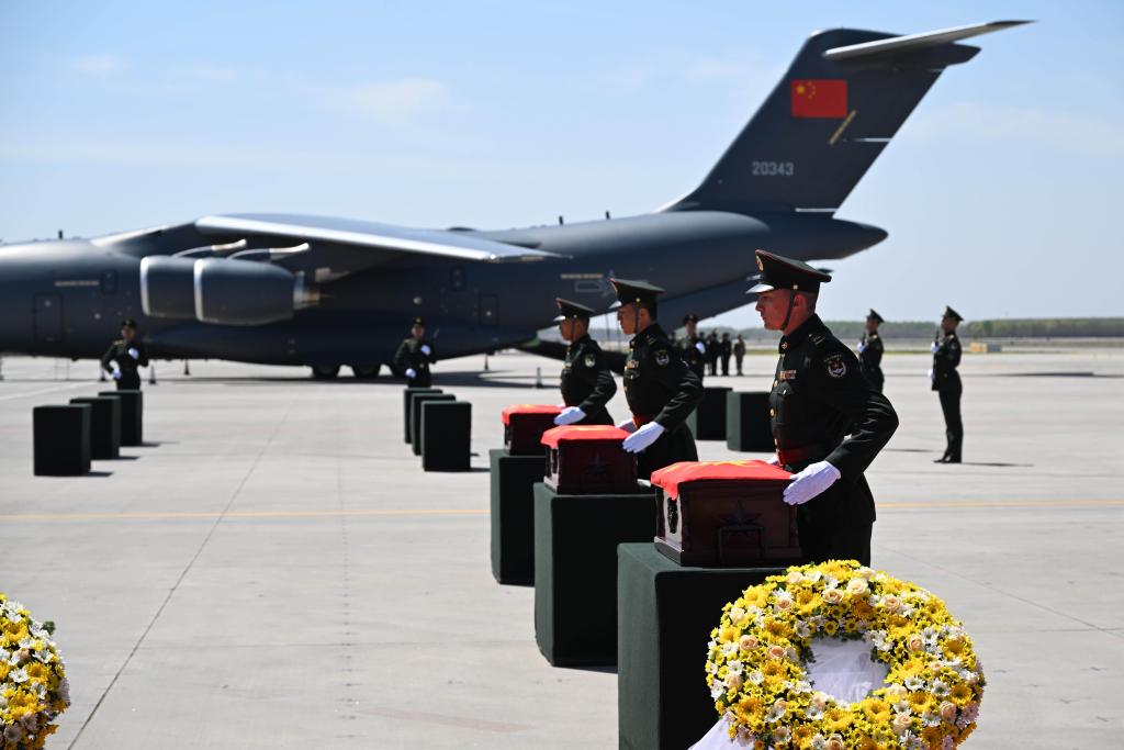 4月22日,第十三批在韓中國人民志愿軍烈士遺骸由中國空軍運(yùn)-20B從韓國接回遼寧沈陽。這是迎回儀式現(xiàn)場。新華社發(fā)(余紅春 攝)