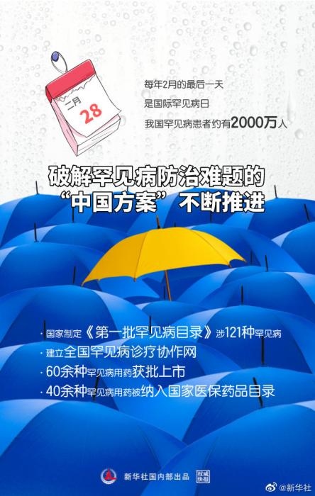 每年2月的最后一天是國(guó)際罕見病日。我國(guó)罕見病患者約有2000萬人,每年新增患者超過20萬人。自2018年以來,有關(guān)部門通過制定罕見病目錄、建立全國(guó)罕見病診療協(xié)作網(wǎng)、成立中國(guó)罕見病聯(lián)盟等措施,不斷推進(jìn)破解罕見病防治難題的“中國(guó)方案”。(記者李恒、田曉航,海報(bào)設(shè)計(jì)魏冠宇)