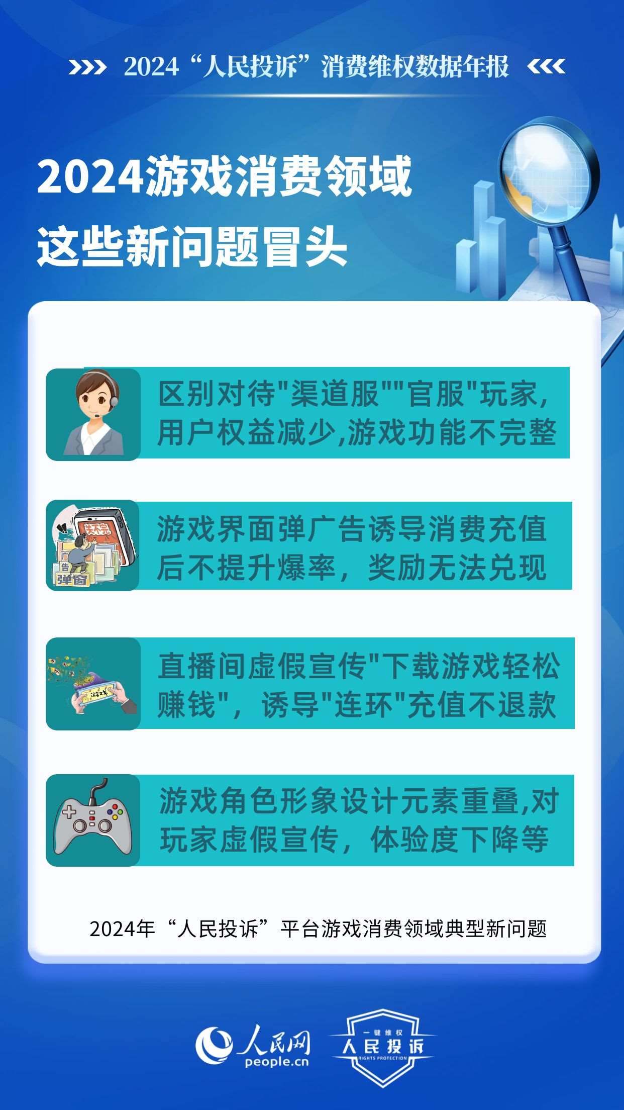 在游戲類,老問題主要有:未成年人網(wǎng)游消費不規(guī)范,平臺以“免費”“紅包”誘導點擊充值,未身份驗證、支付環(huán)節(jié)無提示,提交證據(jù)申請退款遭拒或退款金額不合理;虛假宣傳游戲內(nèi)容誘導充值點券,玩家實際回報/游戲體驗與預期不符;無故封號、游戲裝備丟失、賬號被盜、系統(tǒng)漏洞導致玩家利益受損,客服不回應、平臺不理;系統(tǒng)漏洞、卡頓閃退、匹配機制失衡等網(wǎng)游體驗差等。