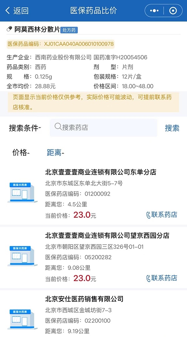 第五步:點(diǎn)擊“在售藥店”,即可看到按照距離遠(yuǎn)近、價(jià)格高低等維度排序的藥店信息。