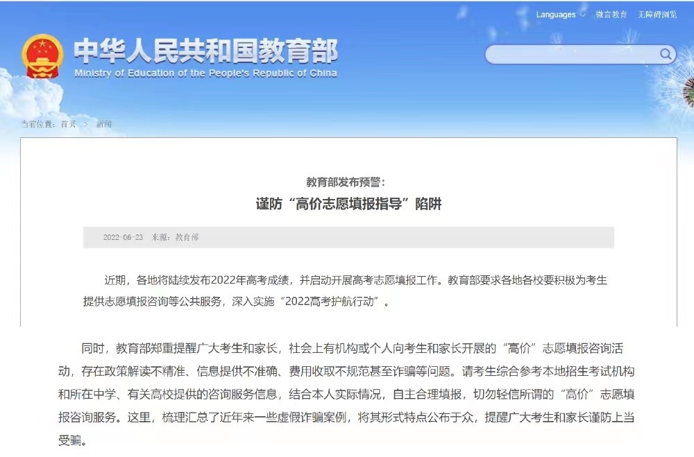 近日,教育部發(fā)布預(yù)警,提醒考生謹(jǐn)防“高價(jià)志愿填報(bào)指導(dǎo)”陷阱。有網(wǎng)站虛假宣傳擁有所謂“內(nèi)部信息”,自稱掌握內(nèi)部大數(shù)據(jù),能夠“精準(zhǔn)定位院?!钡鹊取J聦?shí)上,每年高考填報(bào)志愿前,各省級(jí)招生考試機(jī)構(gòu)都會(huì)發(fā)布當(dāng)年高考成績(jī)統(tǒng)計(jì)情況和近年來(lái)各高校錄取分?jǐn)?shù)情況,并不存在市面上的咨詢機(jī)構(gòu)或個(gè)人聲稱的“內(nèi)部信息”。還有一些咨詢機(jī)構(gòu)假冒所謂志愿填報(bào)專家身份。該咨詢機(jī)構(gòu)打出廣告,稱團(tuán)隊(duì)的專家“獲得高考志愿規(guī)劃師認(rèn)證”“來(lái)自著名高校”等。事實(shí)上,有關(guān)部門從未發(fā)放過(guò)“高考志愿規(guī)劃師”這類職業(yè)資格證書(shū)。該機(jī)構(gòu)一些所謂“志愿規(guī)劃師”都是臨時(shí)招募的社會(huì)人員,按照總部提供的“臺(tái)詞”給考生和家長(zhǎng)輔導(dǎo)。家長(zhǎng)購(gòu)買這些機(jī)構(gòu)的服務(wù)不僅花了冤枉錢,而且可能報(bào)錯(cuò)志愿。
