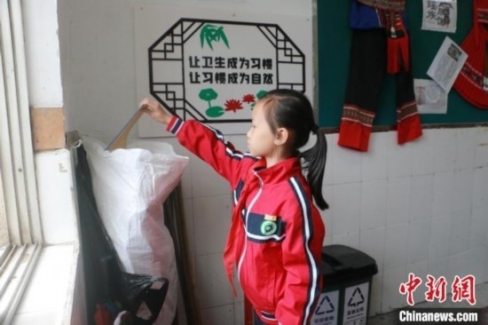 圖為學(xué)生將可回收物放置進(jìn)班級里的回收袋中。林馨攝
