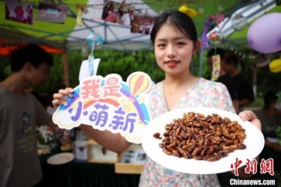 南京農(nóng)業(yè)大學(xué)植保學(xué)院志愿者展示可食用的昆蟲(chóng)迎接新生。泱波 攝