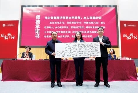 在加強(qiáng)思想政治建設(shè)方面,抓好思政課改革創(chuàng)新,在市屬高校率先全面開設(shè)“習(xí)近平新時(shí)代中國(guó)特色社會(huì)主義思想概論”課,獲批北京市首批重點(diǎn)建設(shè)馬克思主義學(xué)院。持續(xù)開展課程思政建設(shè),得到市委教育工委的肯定性評(píng)價(jià)。聯(lián)動(dòng)社會(huì)大課堂,成立大學(xué)生思想政治教育中心,與北大紅樓、中國(guó)人民抗日戰(zhàn)爭(zhēng)紀(jì)念館、長(zhǎng)辛店二七紀(jì)念館等單位共建一批“大思政課”實(shí)踐教學(xué)基地。堅(jiān)持“五育并舉”,促進(jìn)學(xué)生全面發(fā)展。五年多來(lái),學(xué)校獲評(píng)多項(xiàng)教育部和北京市課程思政建設(shè)獎(jiǎng)項(xiàng)、北京高?!叭恕眱?yōu)秀成果、北京高?!笆演o導(dǎo)員”等榮譽(yù)。一批學(xué)生在文體比賽中獲省部級(jí)及以上獎(jiǎng)勵(lì),展現(xiàn)出新時(shí)代首經(jīng)貿(mào)學(xué)子的良好風(fēng)貌。