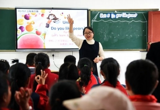 2023年4月13日,在貴州省黔西市鐵石苗族彝族鄉(xiāng)鐵石小學,來自廣州市增城區(qū)中新鎮(zhèn)第二小學的老師在上英語公開課。通訊員 熊軍萬 攝