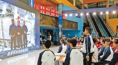 陜西延安科技館“天宮課堂”第四課地面課堂,學(xué)生在向航天員提問(wèn)。鄧志宏攝(新華社發(fā))